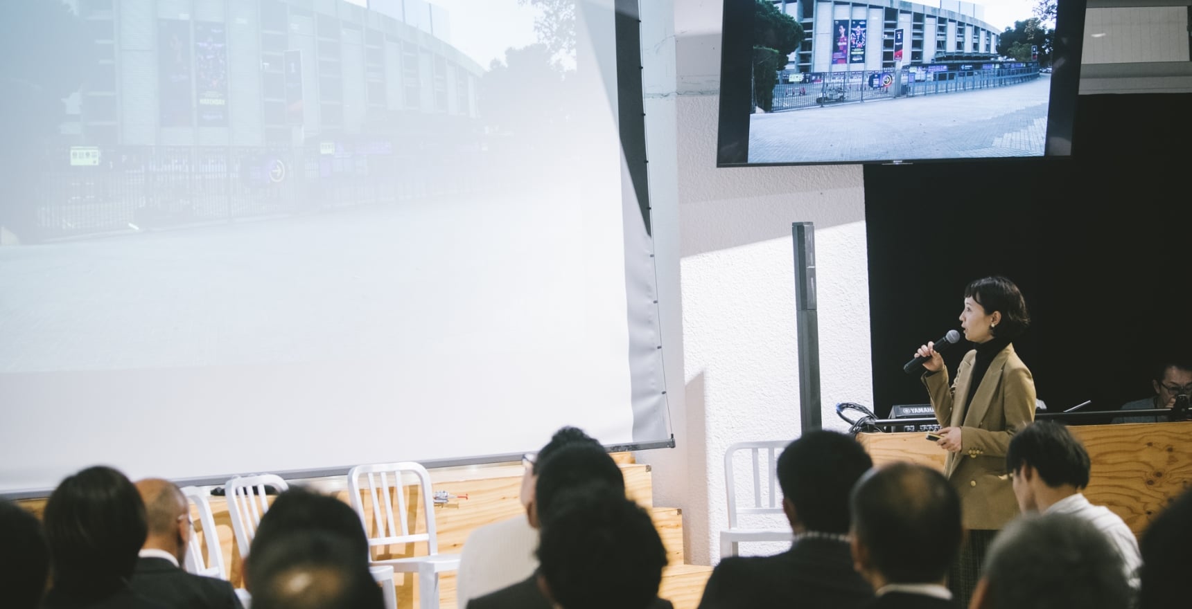 まずはファシリテーターを務める金山からあらためてスタジアム構想の概要が説明されたあと、渋谷未来デザインのプロジェクトデザイナー 金行美佳から、昨年行われたヨーロッパ各都市のスタジアム視察の報告が行われました。