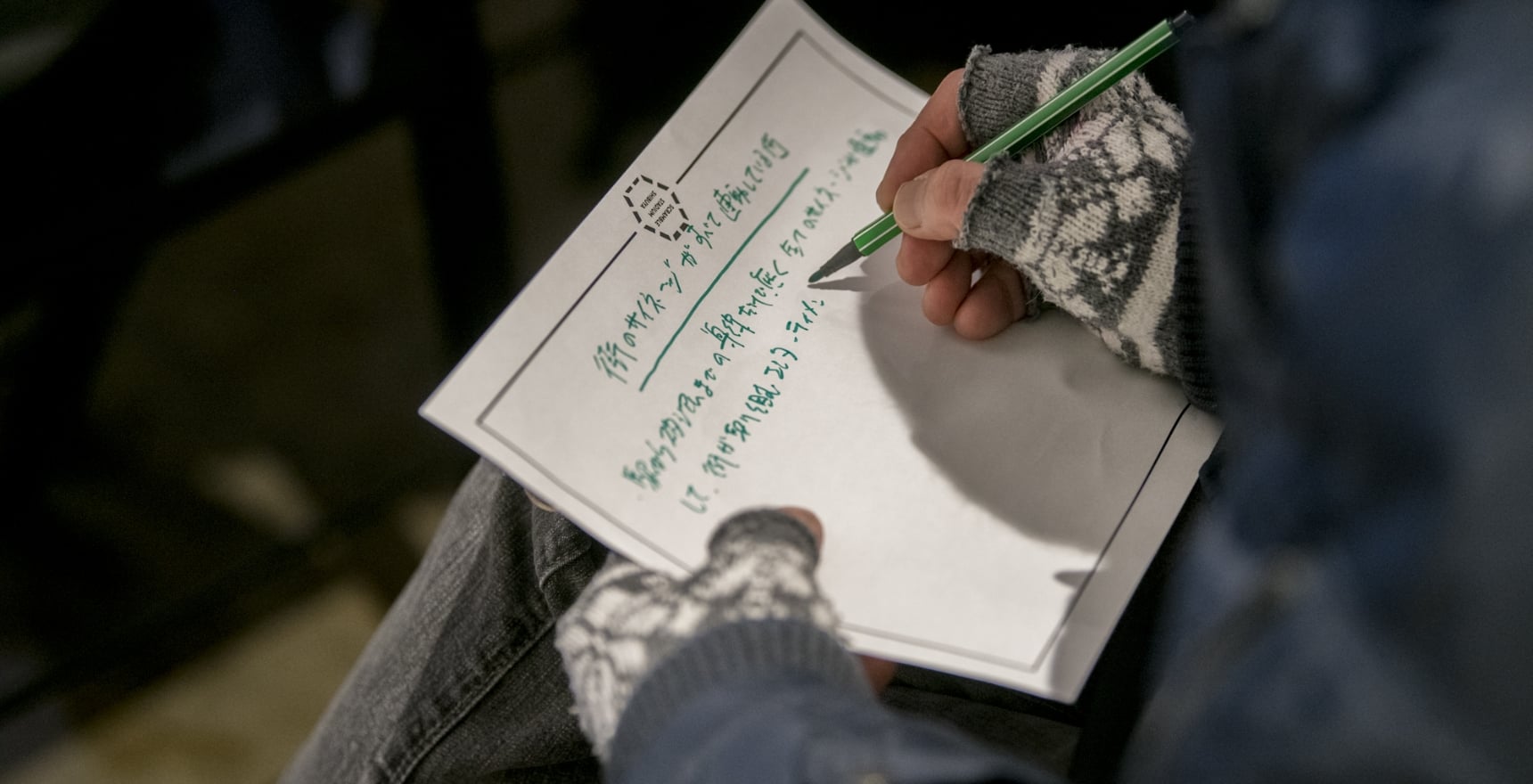 その後、来場した皆さんには紙とペンが配られ、簡単なワークショップの時間に。